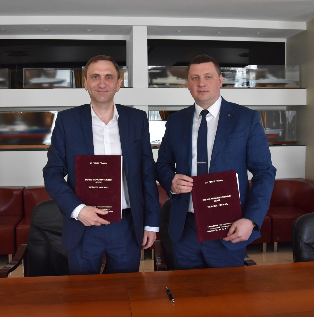 Генеральный директор конструкторского бюро ОСК «Алмаз» Константин Голубев и ректор ФГБОУ «Балтийский государственный технический университет «ВОЕНМЕХ» им. Д.Ф. Устинова» Александр Шашурин подписали Договор о создании на базе Бюро совместного Научно-образовательного центра.